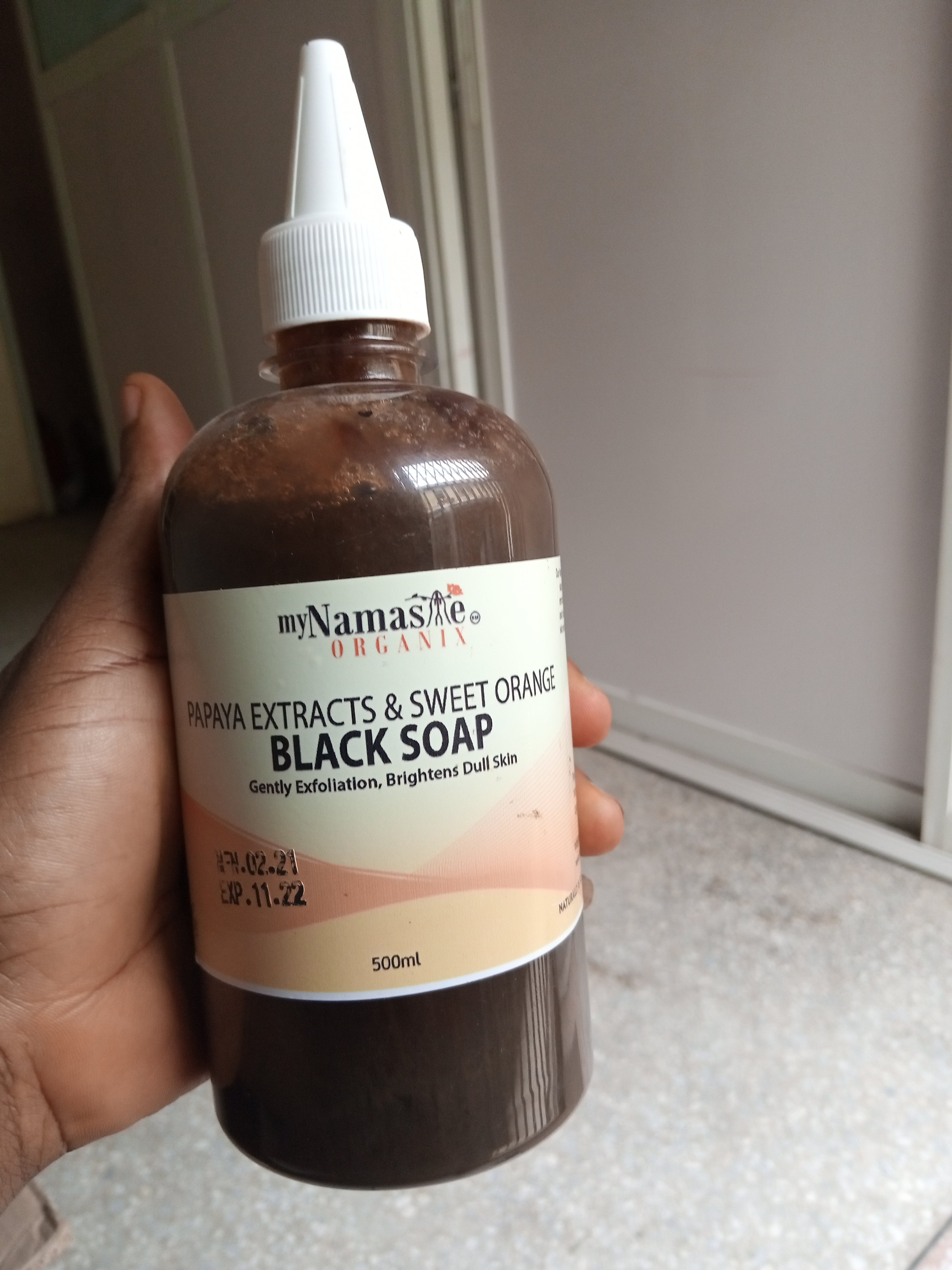 African Black Soap Body Wash With Papaya Seed Extract, Sweet Orange and Patchouli oil. Gentle exfoliation, gets rid of dead skin.